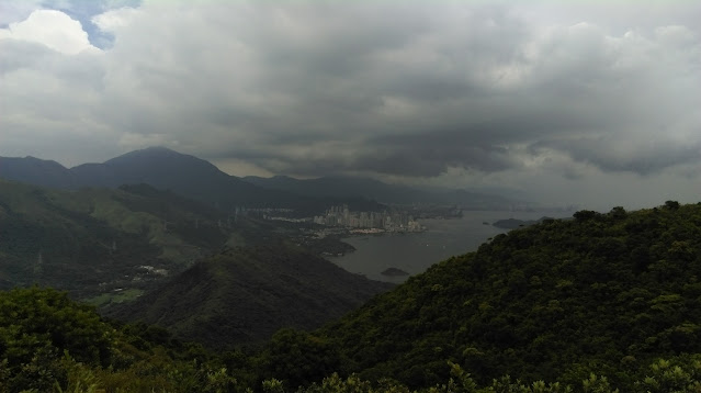 走完石澗後接南涌郊遊徑轉入刀背徑登此處高峰—龜頭嶺(486米)。山頂景觀開揚,可觀吐露港海景及北面深圳市景。但見黑壓壓的大雨雲來勢洶洶,筆者連忙下山,急速走到刀背徑較多樹蔭的段落避雨。雨勢過後,繼續沿刀背徑走到公主山,之後下山走到大塘湖結束行程。
